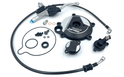 ?Kit contains all the parts necessary to accommodate a hydraulic clutch system. ?Kit contains ?Clutch cover & hydraulic slave cylinder ?Special design oil filter cover with O-ring ?Hydraulic hose, stainless 100cm ?Clutch master cylinder